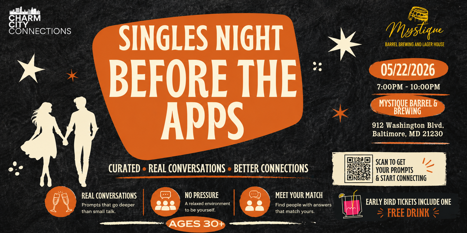 Before the Apps is a laid back singles event focused on real conversations. No speed dating, no forced interactions, just a space to grab a drink and connect with people naturally.